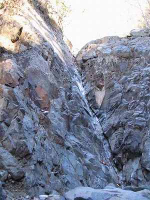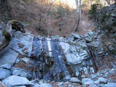 3m程の小滝のところで沢は左方向に曲がり、3mの平板滝は前回('04/12/04)と同じように左側の丸太の上に乗り、這いつくばって越える。