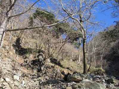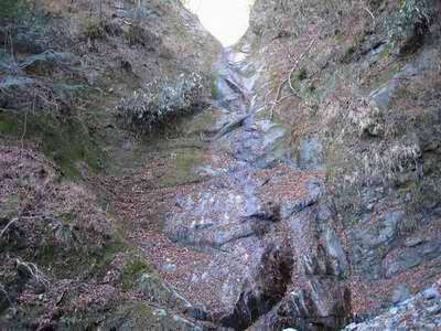 沢幅は狭く、石が不規則にころがり、左右側壁の岩はボロボロで今にも岩が転げ落ちてきそうに見える。