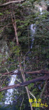 直下の湖面上の滝を3個ほど見ながらガレを30mも進み、二段の滝の下にでる。