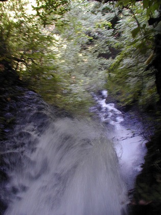 暗い杉林の中に蛇がのたうって天に昇るように大石と岩の間を白い水の流れが駆け上がる。