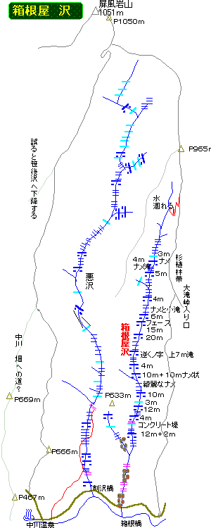 しかし「二俣があって右には大きな滝がある」という彼の説明はどう考えても笹後沢と箱根屋沢を混同してしまっているように思えてしょうがない。