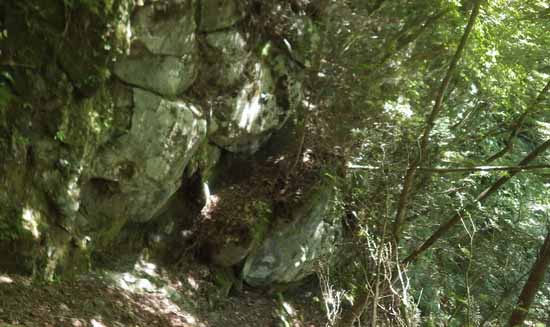歩幅のバンド状を短く5m進み、立木の中を下ると岩溝状に降りる。
