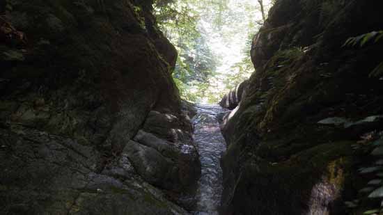 緩く危険とは感じないその岩溝状を15mほど下ると大滝の下に出る。