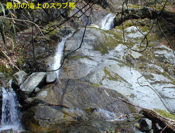 滝の上はまだ同じ岩の続きが続いていて、支流が10m程の石棚で直上し、本流はスラブ25m滝の上縁を狭く使い、グッと右に折れその先にスラブの3m程の小滝が2個重なる。