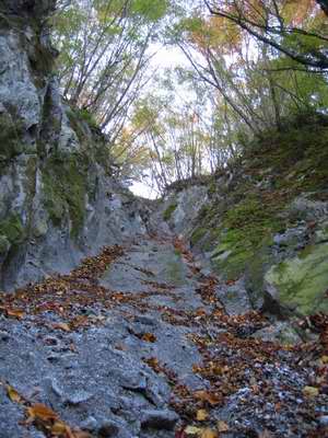 おまけに最後の部分は左右が狭くなり、下から見てもその部分は岩が剥きだしになっていて、あそこまで行ってしまったら、降るに下れず登り切るよりしょうがないことが直ぐに判る。