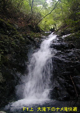 流れ正面には大岩の平面があり、流れはその岩を右から左下に樋凹状に削って流れ下り、最下部は大きなヒョングリに成っている。