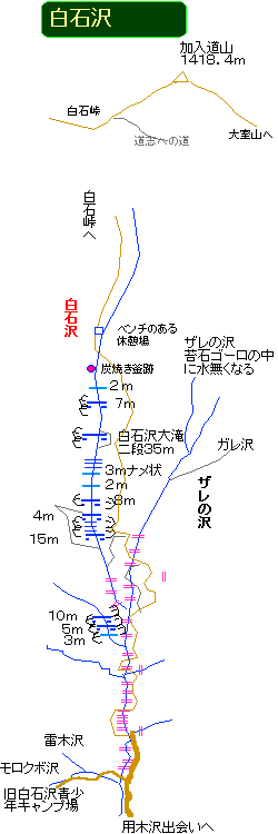 自宅4:55〜本厚木5:18〜新松田5:55富士急バス〜西丹沢自然教室7:15〜モロクボ沢分岐7:45〜無名沢滝見学8:00-8:20〜沢に入る〜登山道に再び合う8:30〜ザレの沢に入る〜水が消える8:50〜登山道に戻る〜登山道から白石沢に下降する9:10〜15m滝9:15-9:35(巻き道で落ち口上へ)〜大滝下へ9:55〜大滝上へ〜8m樋滝〜登山道休憩ベンチ10:20頃〜8m樋滝へ戻る10:30〜再び登山道へ10:35〜モロクボ沢出会い〜白石沢キャンプ場〜西丹沢自然教室11:30分-12:00富士急バス〜谷峨12:54JR〜松田13:05頃〜新松田13:08〜本厚木13:40頃〜自宅14:00 2003/08/30曇り 時々ぱらぱら雨 朝方が一番悪く徐々に雲は薄れていった歩き易い天気で山中では水を飲む必要も無かった。