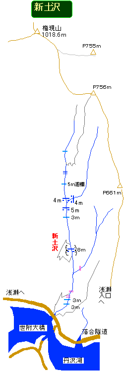 橋の上から覗く新土沢は、この奥に滝の二個や三個は十分に有りそうな雰囲気をもつ沢である。