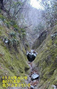 上から転がってきてV字に挟まり、危うく止まった石が2箇所3ヶ所と見える。