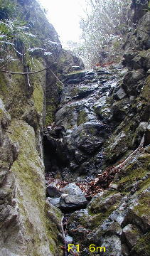 右の傾斜が、それほどでもない5m滝をまず登り、先に尾根が見える狭いルンゼ状を更に50mほど登ってから、左手の立った尾根を越えると左7m滝の上に出る。