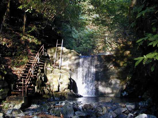 左のガレ場に入り、バス停先のお寺から続く水道管補修径路に出て、鉄パイプ踏み板付き階段を使い、コンクリートで小さく固めた滝の落ち口に出る。