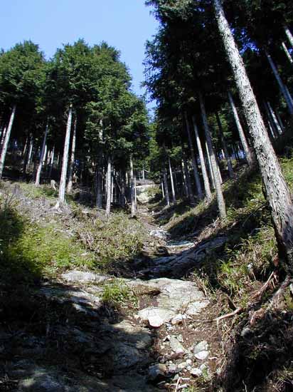 更に10m(15m位かな)の遠目見た目だけの涸れ滝を過ぎると辺り一面に檜植林帯が広がる。