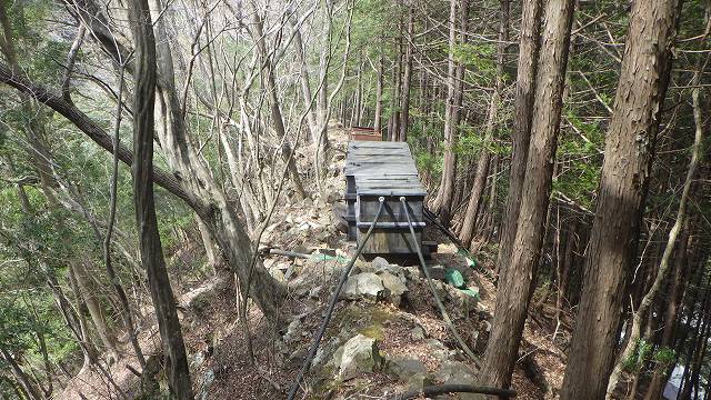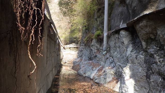 下の集水中継槽から滝上集水口までをつなげて歩けた歩廊は崩れてしまって形もない。