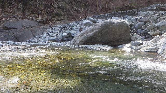 以前は早戸川本流から見える鳥屋鐘沢入り口は癒やし系の優しい風景だったのに、かの大石を押し流した流水によって鳥屋鐘沢上流からの土石が出会い付近に砕屑石の山となって残っている。