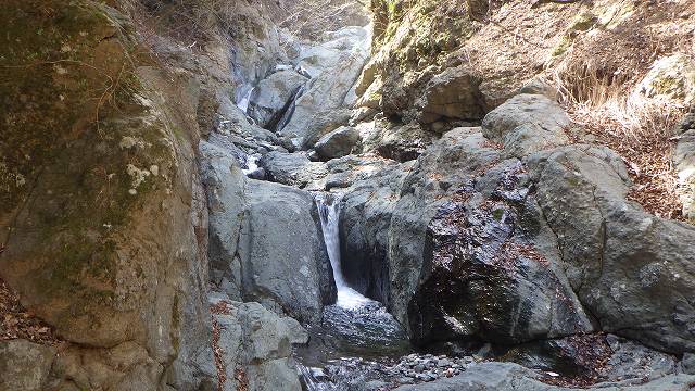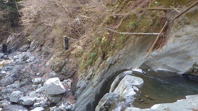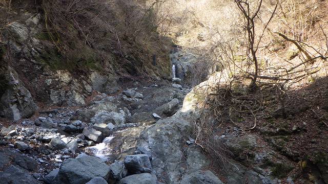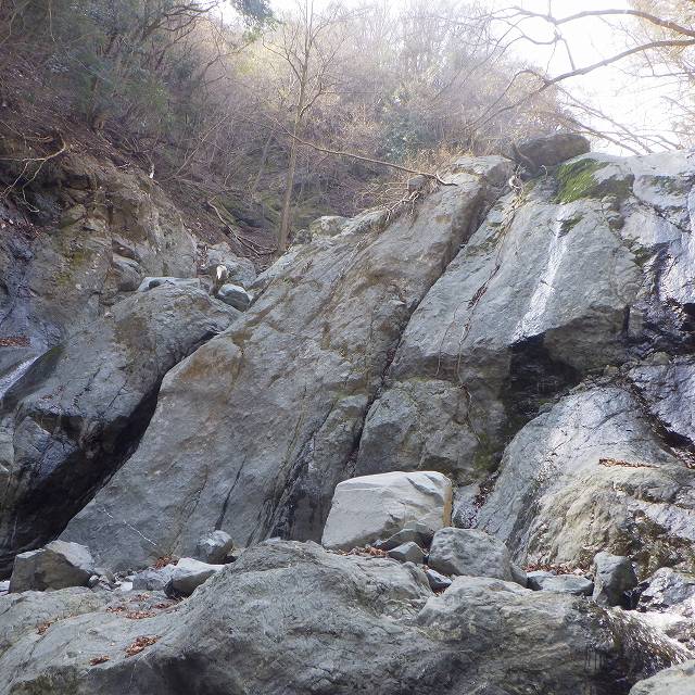 3mの小滝下で右岸のゴツゴツ岩面に上がる。