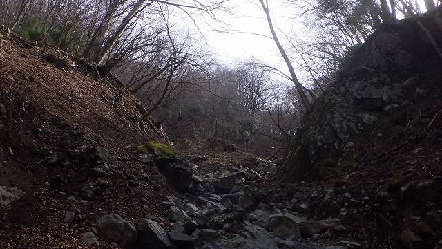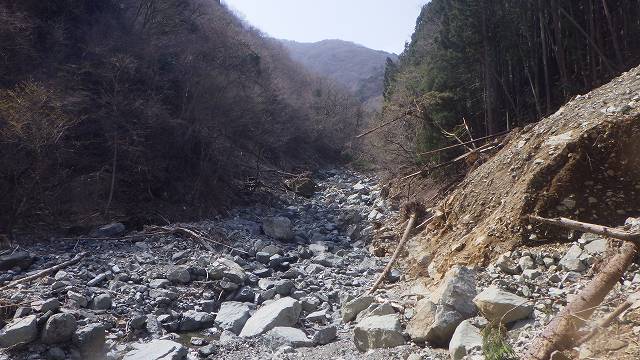 その中に進み、砕石が無くなって元々のナメに移るが、そのナメ床は変わらずとも、滑床周囲を覆っていた土砂の全ては濁流に剥ぎ取られてゴツゴツな岩がむき出しになっていて、沢沿いに伸びていた経路道は跡形もない。