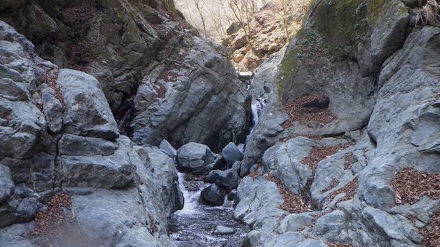 狭い岩床を右から左に飛び移り、続く小滝(幅1m以下の樋)は左側の岩場から巻いてかわす。