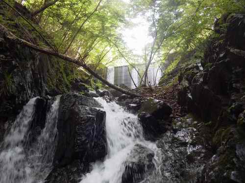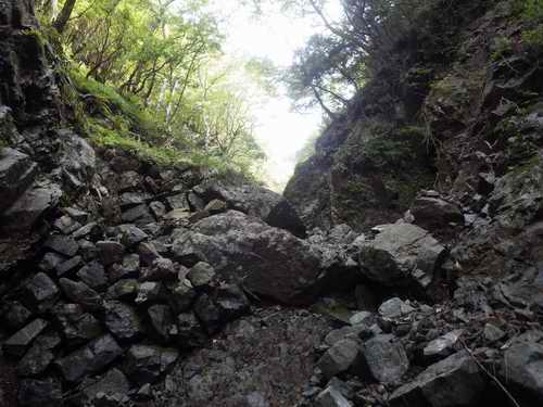そこで一応は砂防堤群と砂防河原が終わり、両岸が中に押し出し、狭くなった沢に入る日射しを遮る。