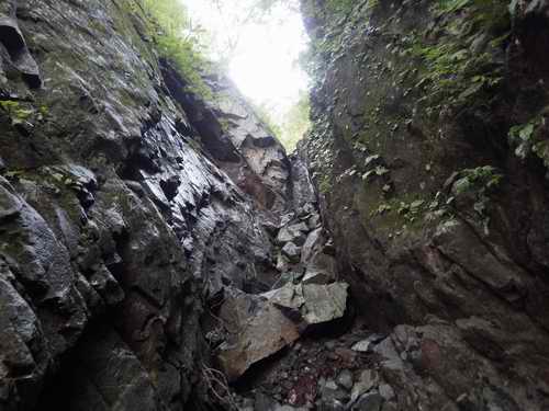 落口付近の岩は、下からは脆そうな上に本体から剥離しているように見える。