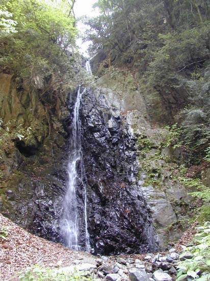 下に小さな滝があり、その上にも小さな釜があって、その釜めがけてスッキリと流れるこぎれいな滝だった。