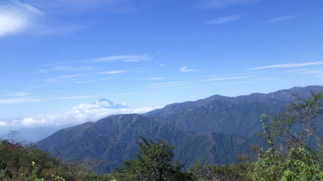 大山から雲間に富士山がほんの少しだけ