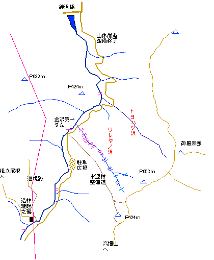 P653mと高畑山側ピークとの鞍部から高畑山側ピーク650m)から金沢林道に降りる尾根に連絡するためのものであろうとの見当は付く。