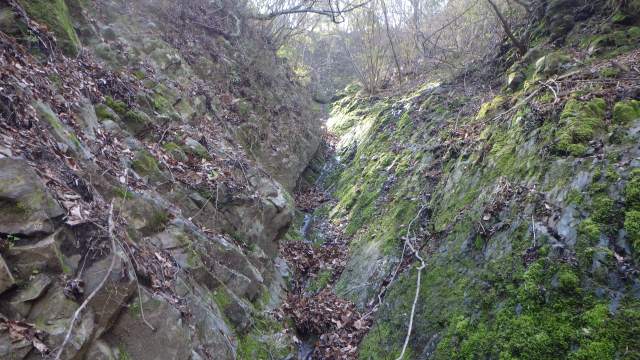そこからは黒い岩床の上にわずかに水が流れてきて、奥に小さな二股があり、その上を見れば、手を伸ばせば届きそうな感じに稜線が見える。
