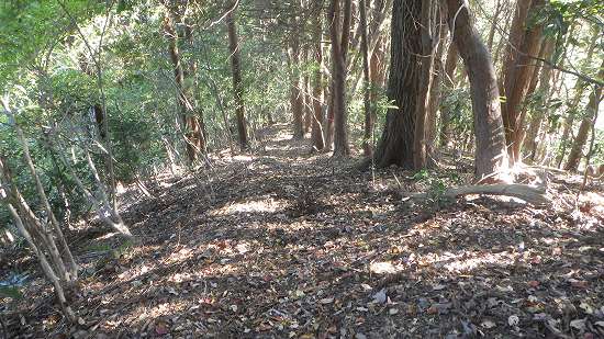 駆け下るほどには緩くなく、踏み跡上に油性の枯れ葉が多く乗っているので滑らないように注意する必要があるが、それ以上の悪場はなく順調に下る。