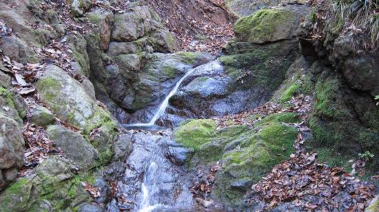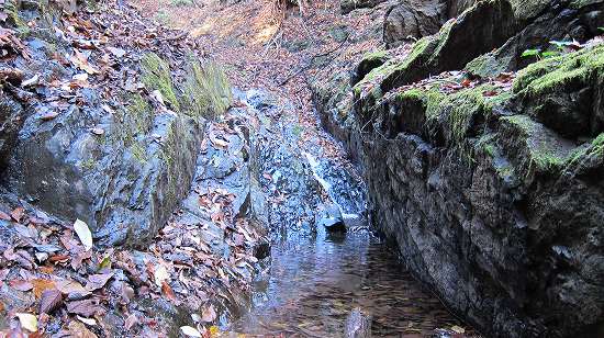 水溜プール脇から沢に入り、左に緩く曲がると滝が見えた。