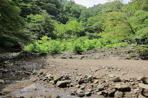 先ほどの唐沢峠下の川原に立ち、峠に登り返して不動尻に下る。
