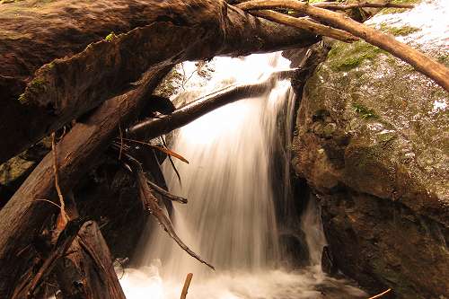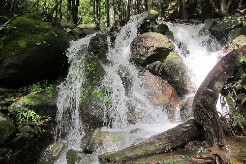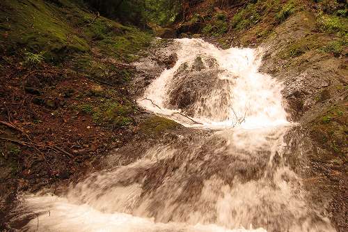 青藤沢は左に別れて登山道が斜面を登っていく屈曲点の小滝の所から沢に入り、小滝を越えて次の倒木掛かる小滝の水中を済ますと沢は二分する。