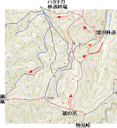 自宅6:30〜土山峠〜堤川林道終点7:40〜ハタチガ林道終点8:05〜ハタチガ沢8:15〜矛岩9:55〜稜線10:05〜鍋嵐10:20〜能の爪10:40〜標高600m付近から右手の小尾根に入る10:50〜堤川(林道終点)11:05〜自宅12:00 20221119 晴れ
