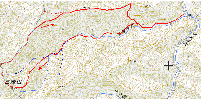 右岸上方に見える大岩に赤ペンで○が記されているのはP777mからの支尾根の出入り口がココであることをしめしている (経路のようになっている)