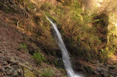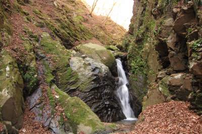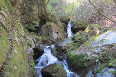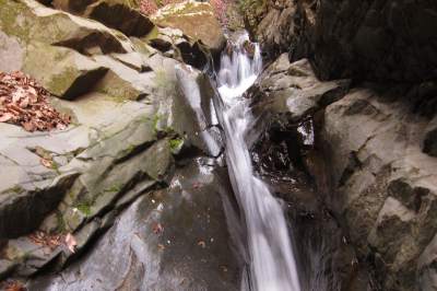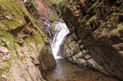 左側から簡単に (滑らないよう注意して) 済まして、少し行くと左岸に直瀑滝(8m)が落ちてくる。