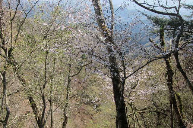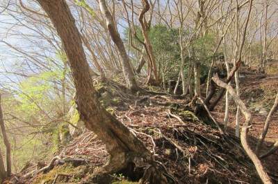 50m程で脆さは薄れるが、岩場主体の痩せ尾根が続いていて、こんな所を登っていて大丈夫かなと危惧するくらい急に見えるが、木の根がハシゴ段の様に付いていて、実際に登っていると危なさは感じない。