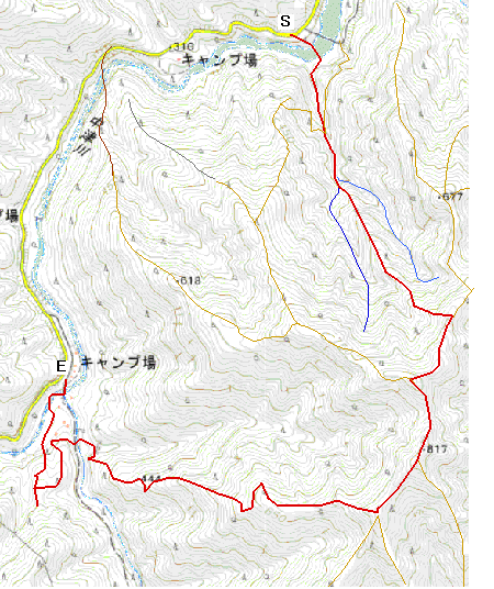 鍋嵐(P817m)からP710m側に進んで少し下がり、少しだけ上がって直進はP710mだが、左右に降りる尾根にも赤プラ杭が打ってあり、左は丸淵方向へ、右は中津川風穴沢出合の中村工務店飯場(廃屋)への経路である。