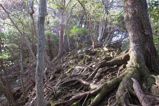 尾根に入る。急でも木の根が梯子のようにセット済みだ