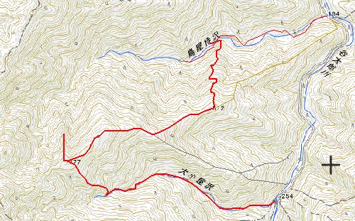 女子トレランナーが行く後を追い、谷太郎林道終点から境界尾根への登山道に入ってすぐに大小屋沢に沿う経路に進む。