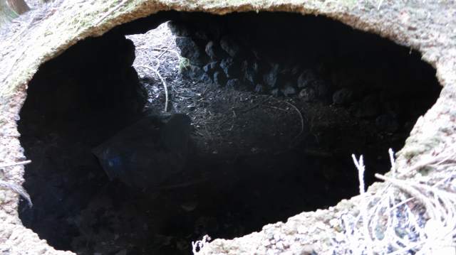 排煙筒差す径10cm程の穴が炭焼き釜の天井に小さく空いていて、その天井に乗って跳ねても全然壊れる気配無い丈夫な様子で、それ以降も20年くらいは変わりは見えなく、5年前に来たときは穴から射し込む光が少し多くなったように見えはしたが、まだまだ大丈夫だろうだったのが、今日来て見れば天井穴は径60cmを越える穴となり、穴の縁は見るからに薄く、そんなのは恥ずかしいから乗って跳ねはしないが、今冬の降雪の重さには堪えても、リアルに俺が乗ったら壊れるであろうし、このままでも何年も持ちはしないであろう。