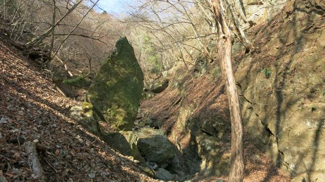 少ないが水はあったが、大岩三段積みの滝状を登って次の石積み先からは水無しの石ごろごろの広めの沢となり、それが少し狭まったところの右岸ごく近くに槍の穂先 (カクレ岩という固有名詞がついているらしい) のようなのがあって、本日の沢歩きはココまでである。
