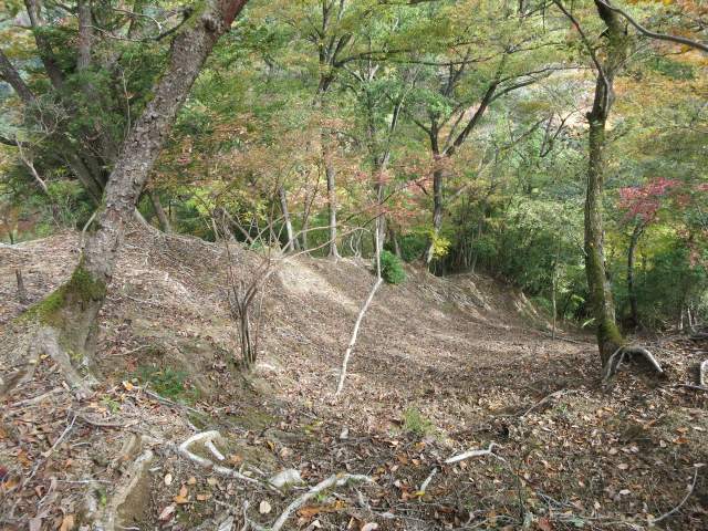 『能ノ爪』から宮ヶ瀬尾根を標高六百m付近まで下ったところで北東に下る経路(路肩丸太が僅かに残るのみ)に入り、