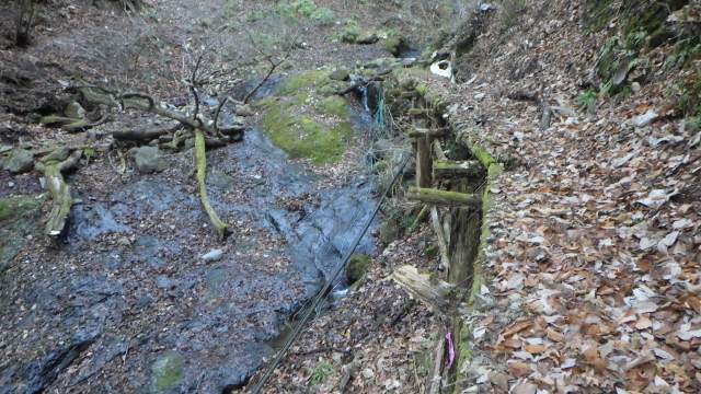 この道、その電信柱様な丸太は腐って痩せて細り、部分的には乗ると落ちる事もあるかもとの感じだが、前回(一昨年)通ったときは砂が堆積して足が谷川に流れて歩きにくかったが本日は砂は除去された歩きやすい道が続いていたのは、此処ら一帯の森林整備作業 (本年に行った間伐作業) のためであったらしい。