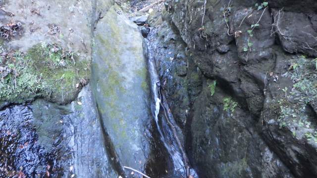 これ以降も小滝は出てくるが、顕著に滝らしいのはもう一カ所水が無くなってからの4mで、それも含めて岩は順層で手でしっかりと掴めるし、足の置き場に困ることもないから、以上の二個の滝以外は杖を終始手から離すことは無かった。