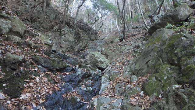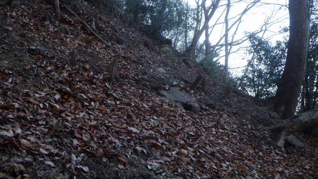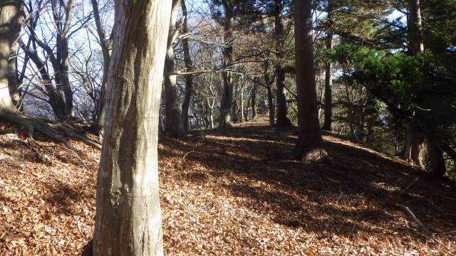 所々の斜面で枯れ葉で滑りはするが、倒れると危険という所も無く、傾斜が緩くなって葉の落ちて日の射し込む雑木林を歩くのは愉快でもある。