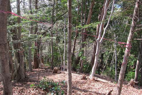 直進方向には境界杭 (神奈川県コンクリ製) が埋まっていたが、進まない方がよいというサインらしくピンクテープが杉と杉の幹の間に張ってあった。