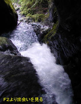 さっき真下とは言ったが、少しトラバース気味に下降したので、その場所は落ち口より3m程上のゴルジュ中だから、ダイレクトにF2に落ち込むことはないとは思う。
