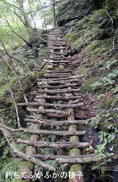 左岸につけられた仕事道を探し、もう10年以上もだれも使っていないような、でも、かってはものすごく立派だったと思われる腐った20mもある長い梯子道を見つけておそるおそる下る。