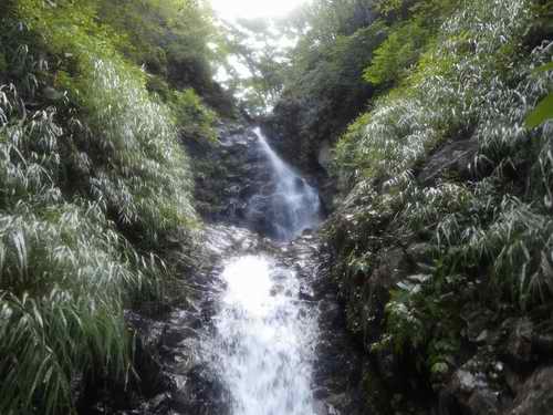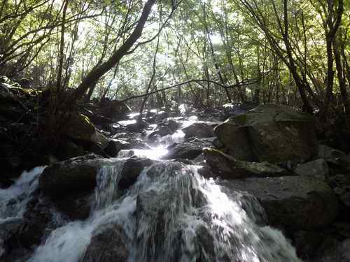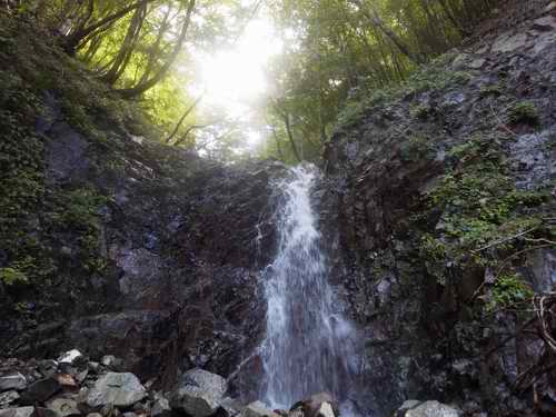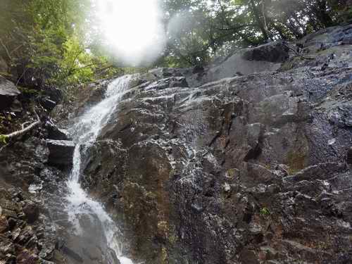 滝見はそれくらいにして、岩尾根が終わるまで経路を上がり、水平部から下に降りる易しい道で沢に降りて、そこから沢歩きが始まる。