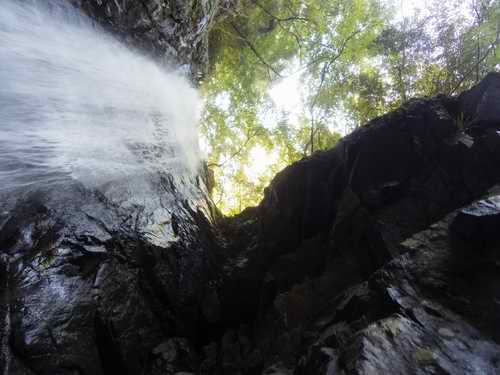 下からの沢音が滝の轟音に変わり、下方にエビラ橋横の東屋が見えてきて、岩尾根上の経路からF2落口を目の下に確認する。