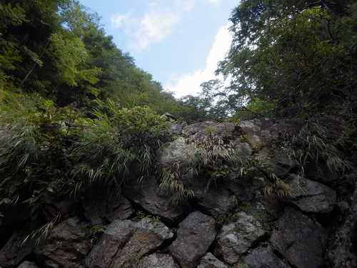 小石が乗って滑りやすい滝横の小坂を登り、左手から流水崩石溝を横断したら、右斜面にくくりつけられている木梯子を登る。